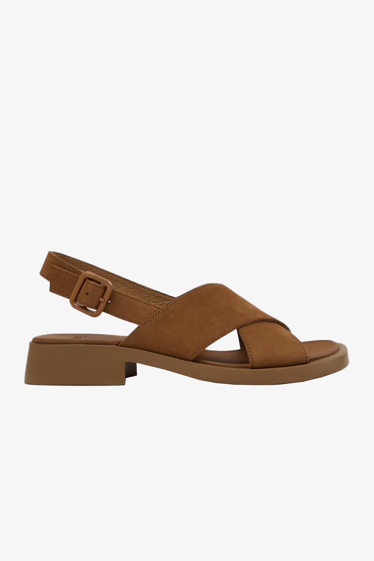 Kadınlar için kahverengi dana derisi nubuk sandaletler; çıkarılamayan OrthoLite® Recycled™ iç tabanlara ve XL EXTRALIGHT EVA dış tabanlara sahip.