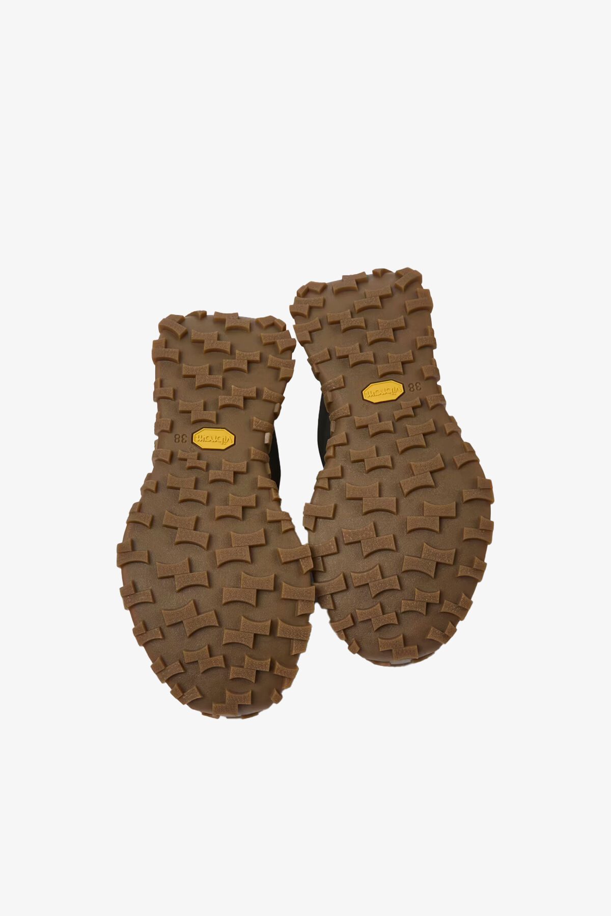 Siyah tekstil ve nubuk kadın spor ayakkabılar, çıkarılabilir OrthoLite® Recycled™ tabanlı ve Vibram® dış tabanlıdır.(%70 EVA, %30 Kauçuk).