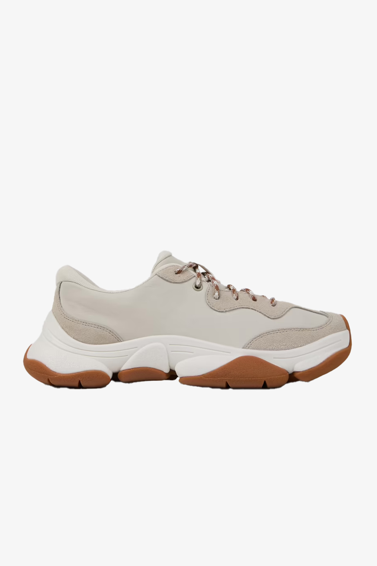 OrthoLite® Recycled™ tabanlık, ReXarge orta taban ve %30 geri dönüştürülmüş Vibram Ecostep dış tabanlı beyaz ve gri boyanmamış dana derisi ve nubuk erkek spor ayakkabısı.