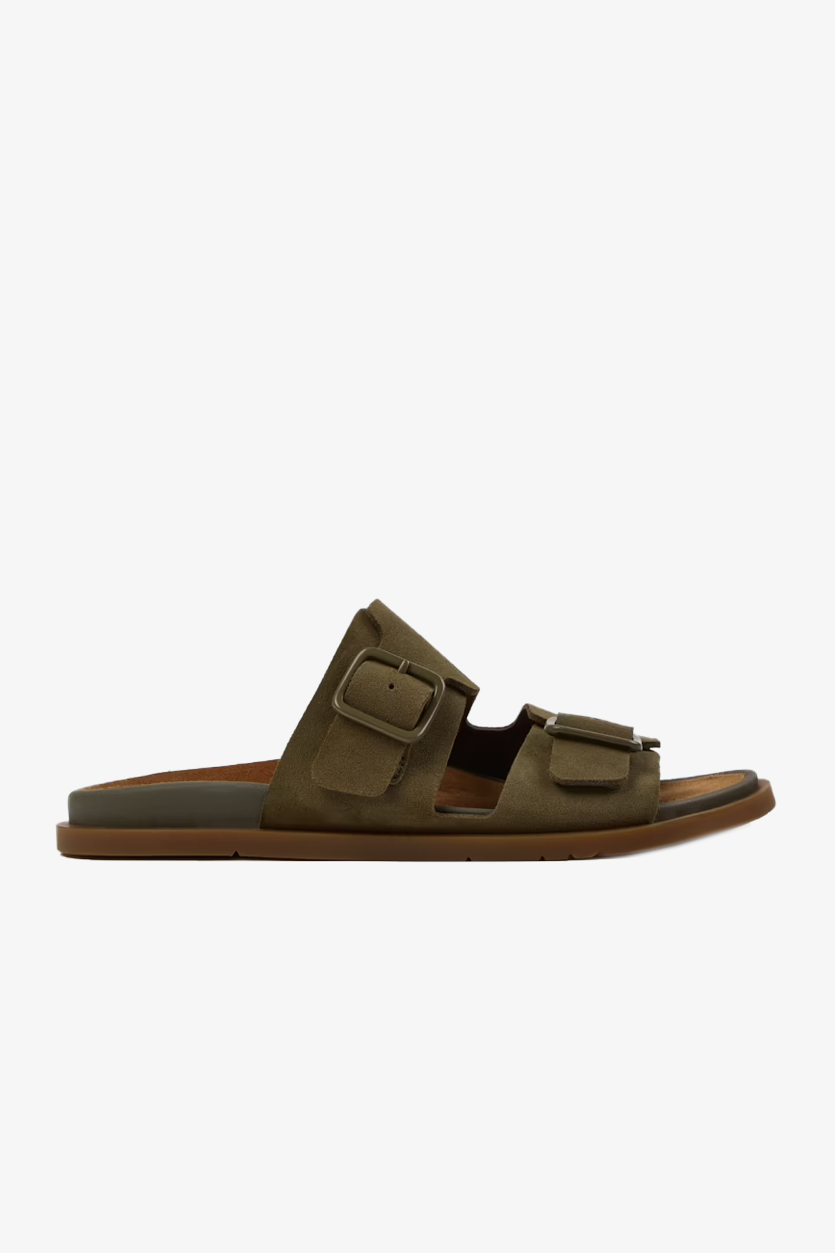 Erkekler için yeşil dana süeti sandaletler; çıkarılamayan PU iç tabanlar ve kauçuk dış tabanlara sahiptir.