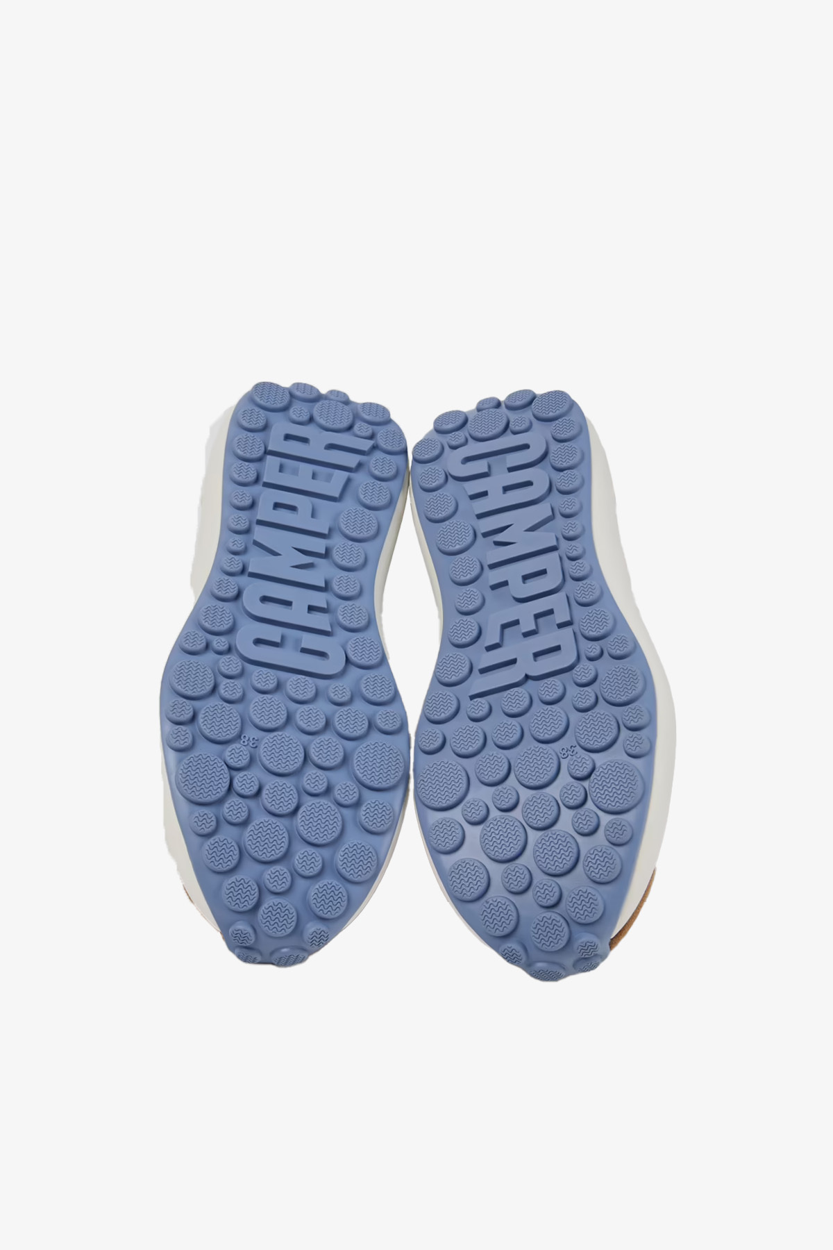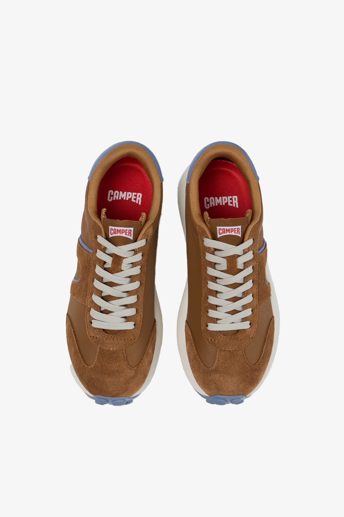 OrthoLite® Recycled™ tabanlıklı, EVA orta tabanlı ve kauçuk dış tabanlı, kahverengi ve mavi dana derisinden ve nubuktan üretilmiş kadın spor ayakkabısı.