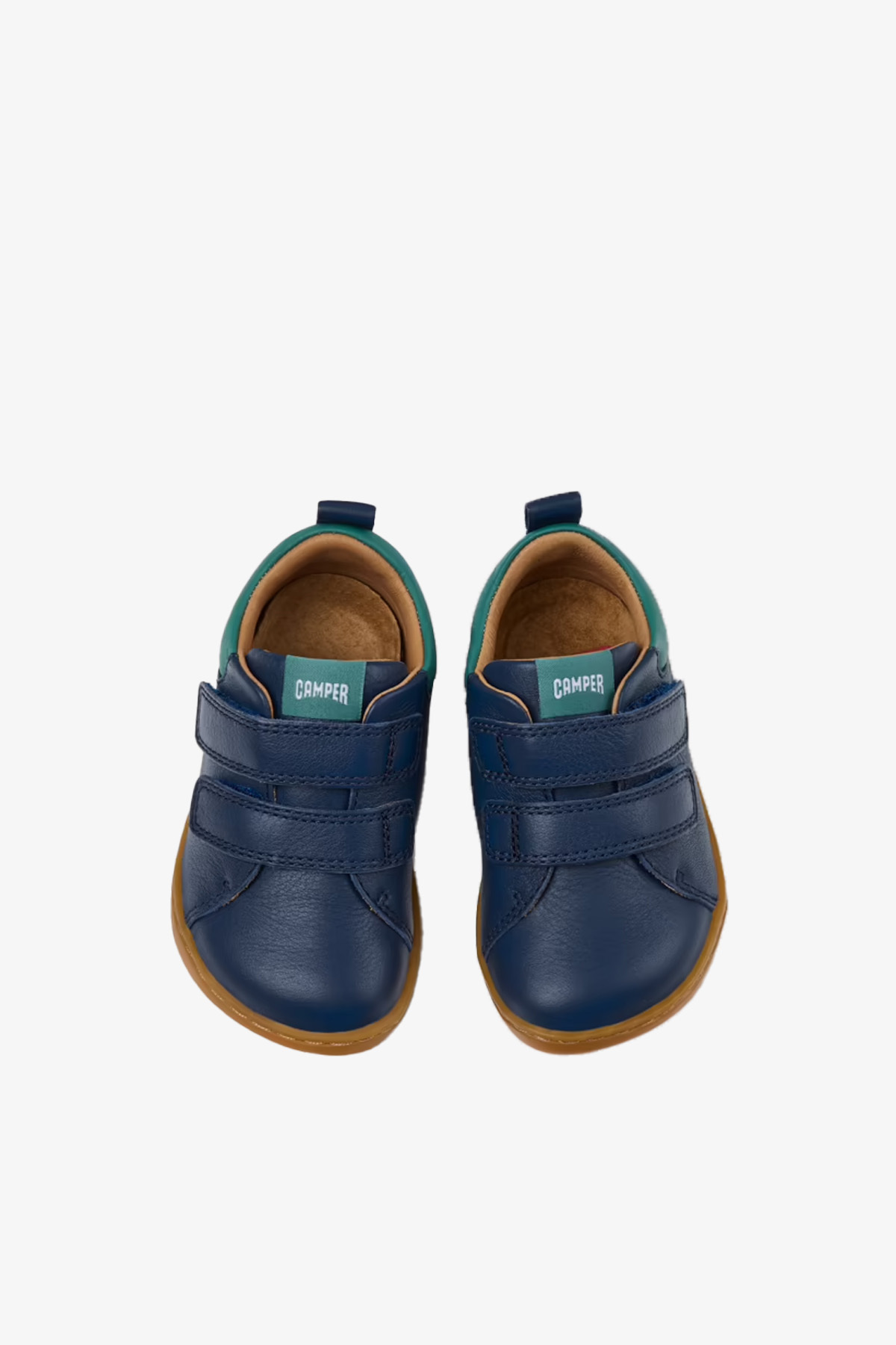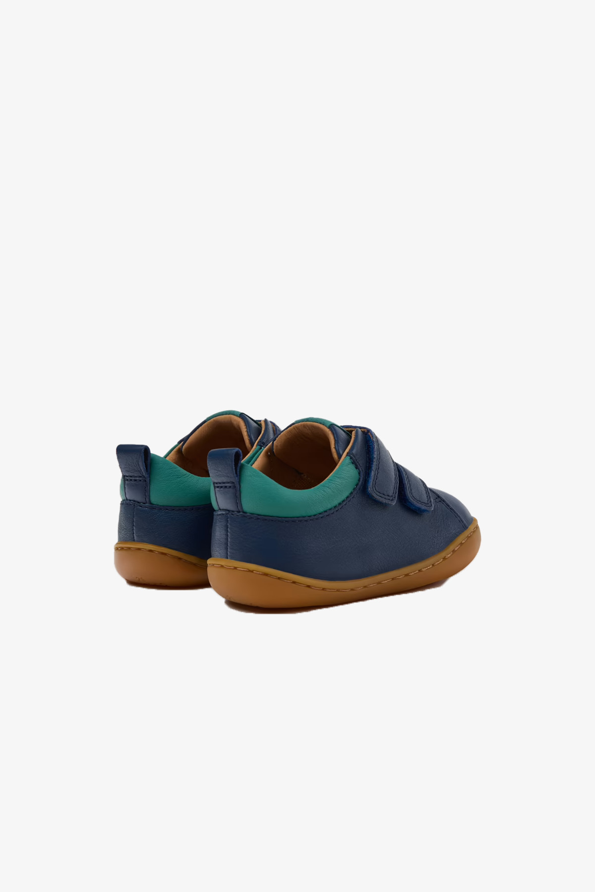 odoactiva sertifikalı, çıkarılabilir EVA iç tabanlı, cırt cırtlı sistemli ve kauçuk dış tabanlı ( %20 geri dönüştürülmüş) mavi ve yeşil dana derisi çocuk spor ayakkabıları.