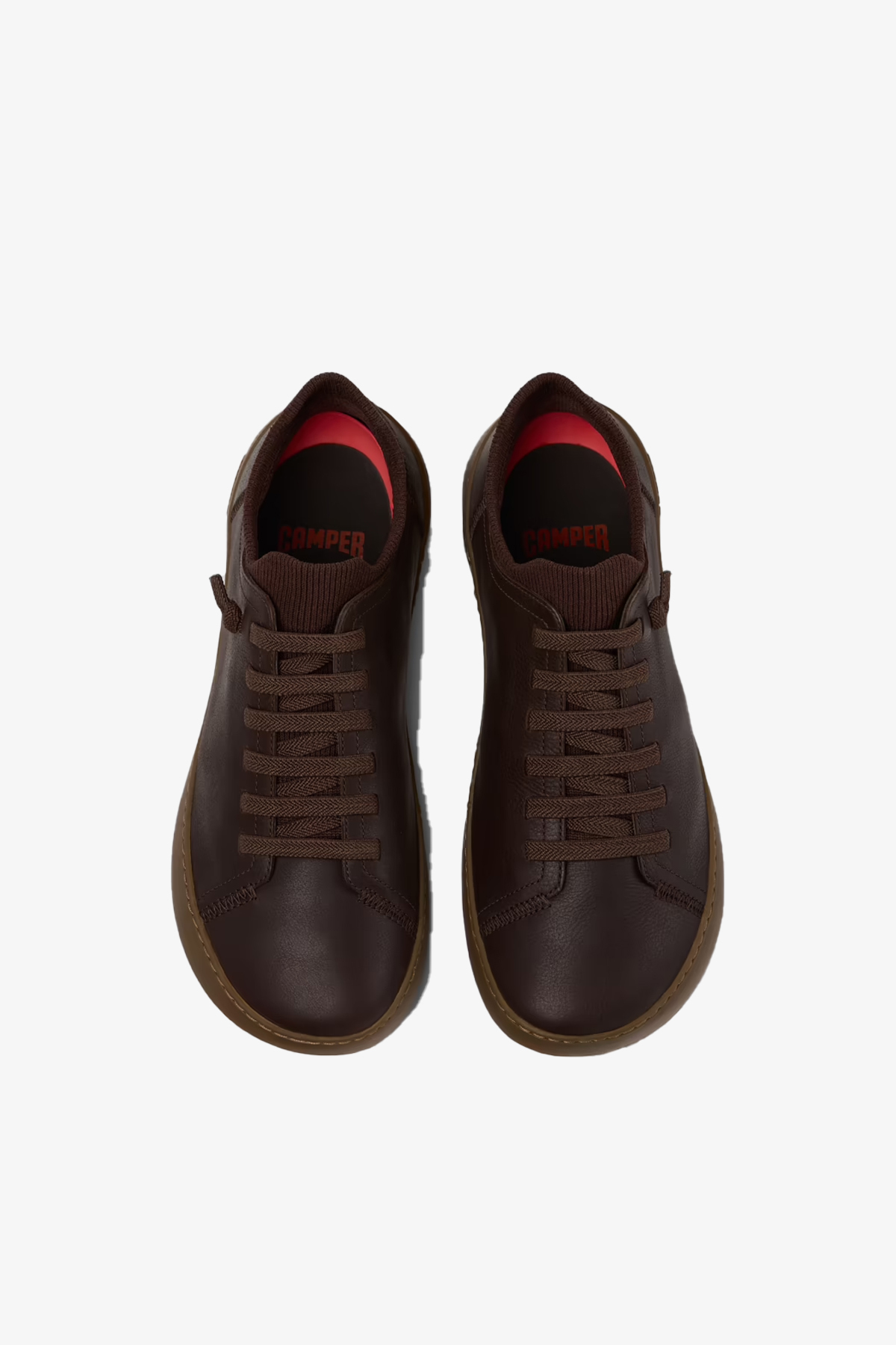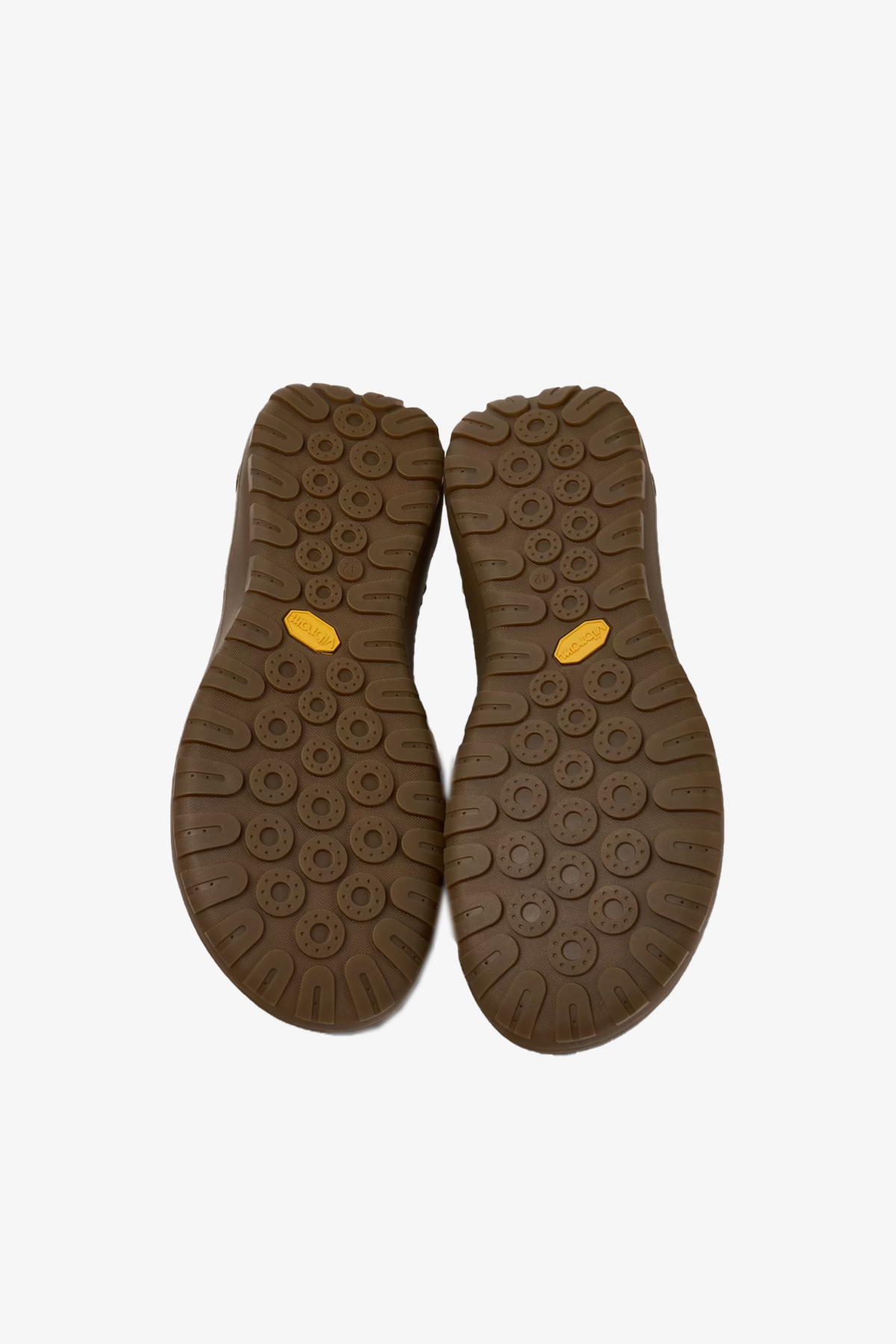 Pratik iç çoraplı, elastik bağcıklı, EVA tabanlıklı ve %30 geri dönüştürülmüş Vibram Ecostep dış tabanlı, kahverengi rejeneratif dana derisi ve kumaş erkek ayakkabısı.