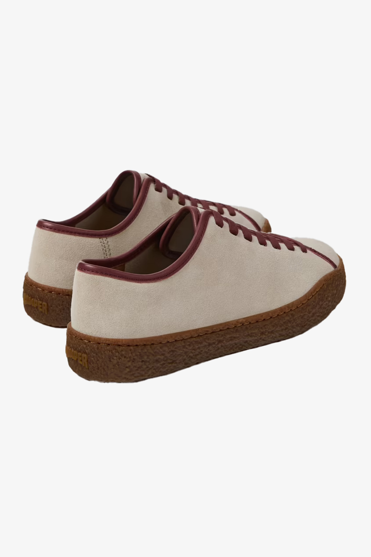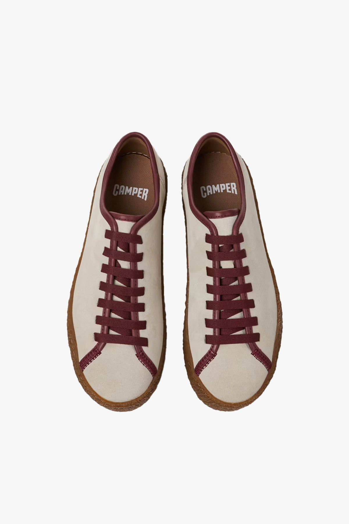 Kadınlar için bej ve bordo dana süeti ve dana derisinden ayakkabılar, çıkarılabilir OrthoLite® Recycled™ iç tabanlara ve kauçuk dış tabanlara sahip.