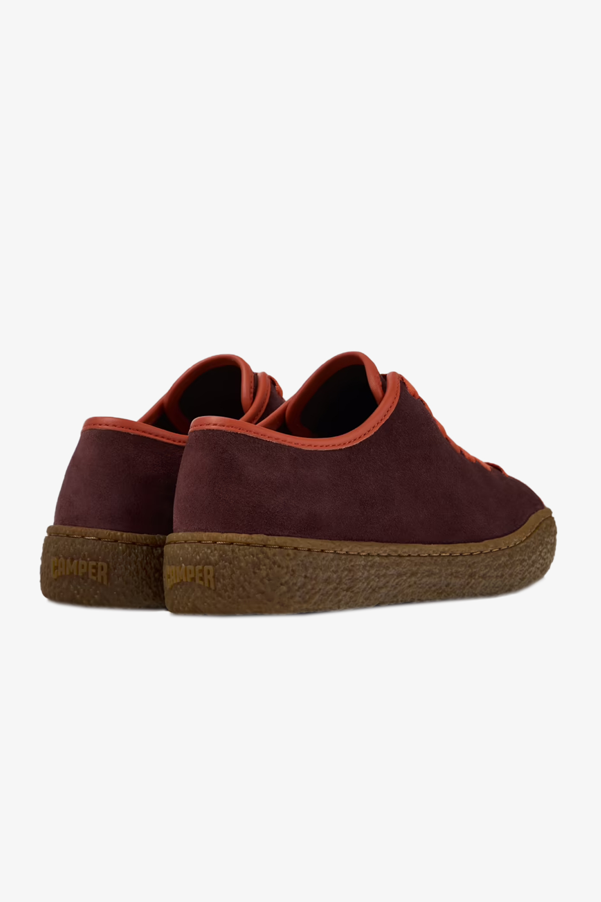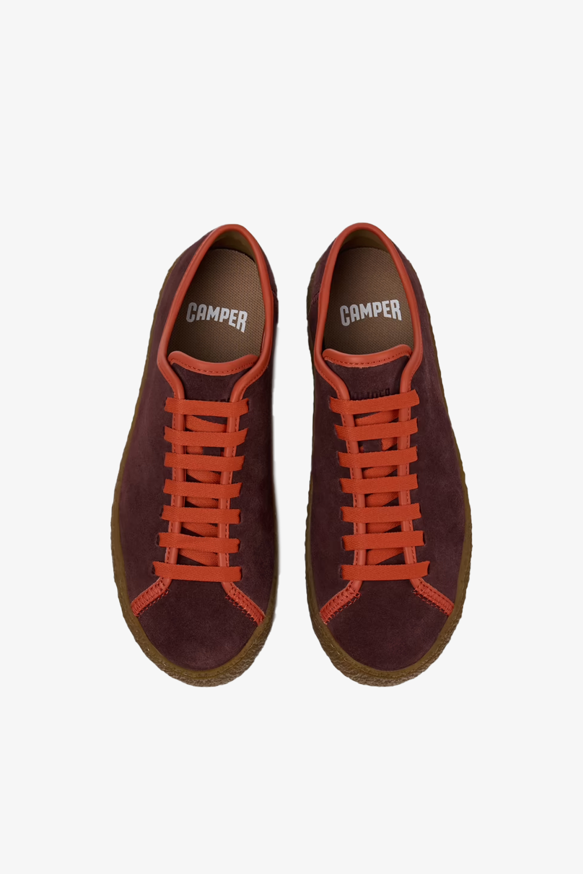 OrthoLite® Recycled™ tabanlık ve kauçuk dış tabana sahip bordo ve turuncu dana derisi ve nubuk kadın ayakkabısı.
