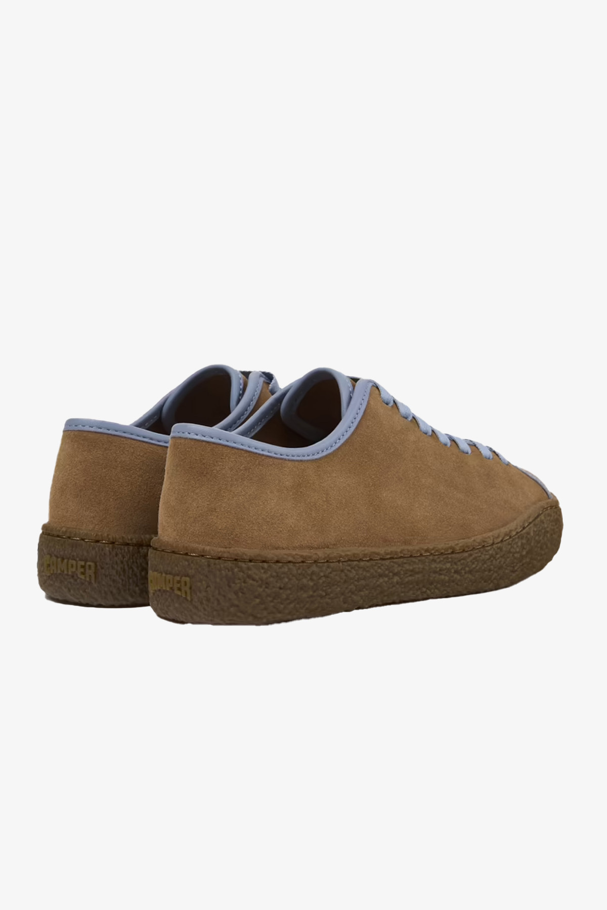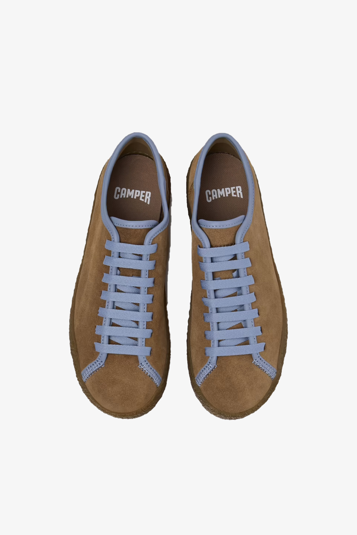 Kadınlar için kahverengi ve mavi dana süeti ve dana derisinden ayakkabılar; çıkarılabilir OrthoLite® Recycled™ iç tabanlara ve kauçuk dış tabanlara sahiptir.