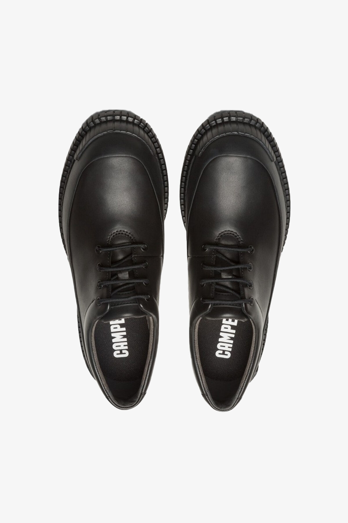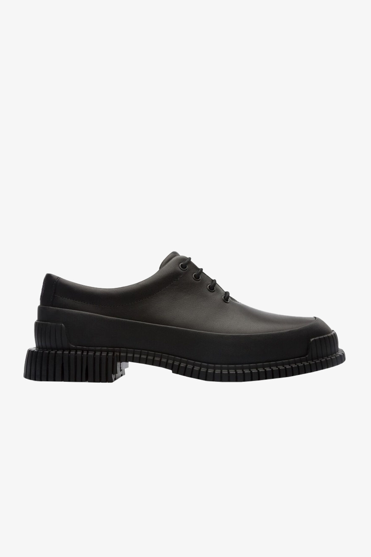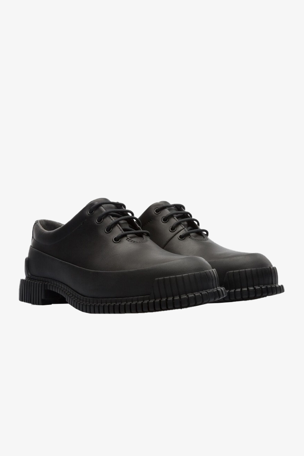 Gelince Haber VerKadınlar için siyah bağcıklı şık ayakkabılar. Tam damarlı deri ve dikey kesimli EVA dış taban.